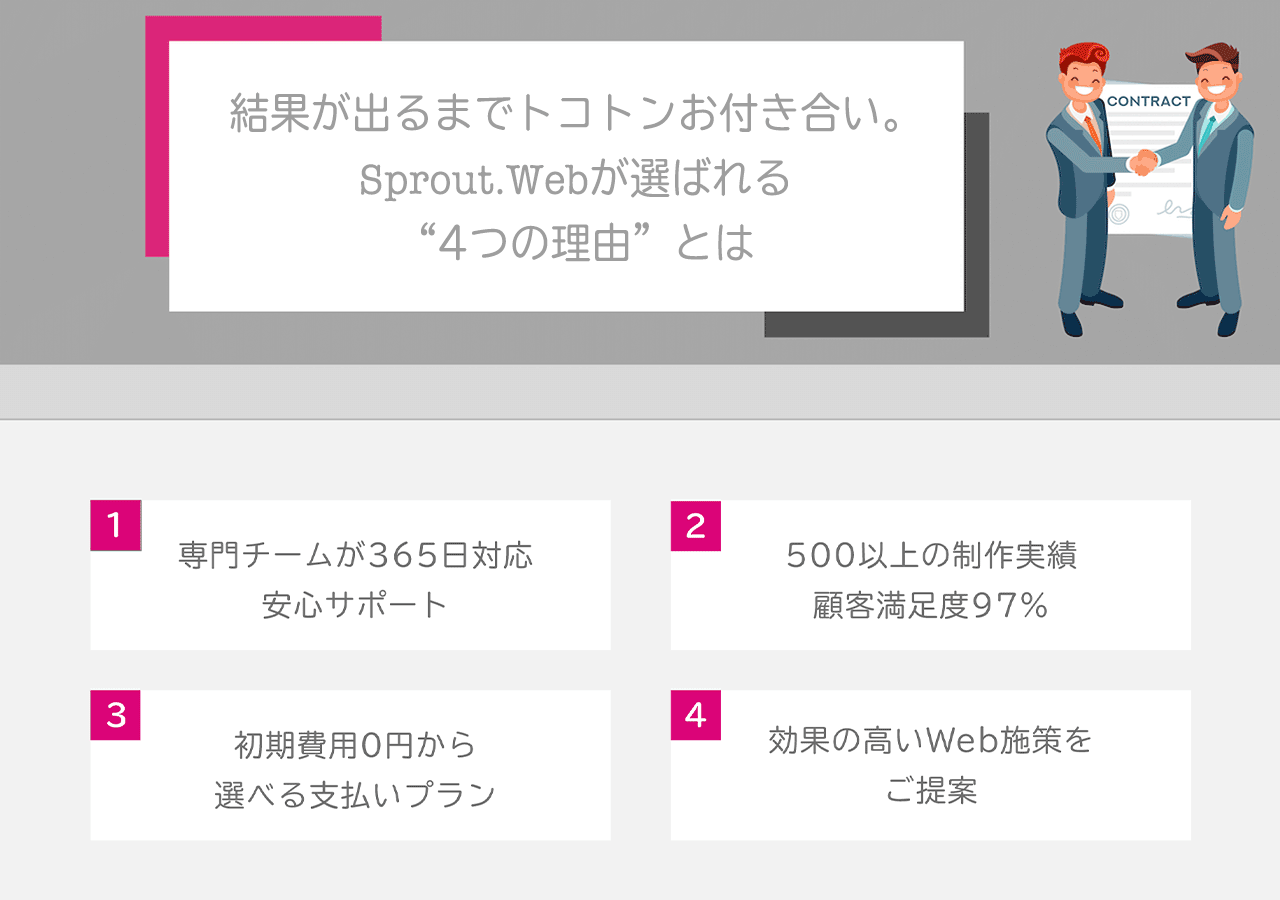 HP制作会社は国内だけでも数多く存在します。そのためお客様から「会社ごとの 違いがわからない、スプラウトさんは他とどこが違うの?」といった質問をいただくことも少なくありません。